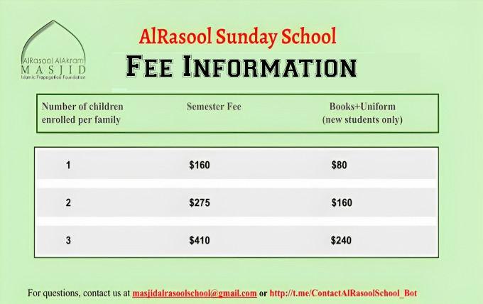 For any questions regarding the form or payment options, you may email us at masjidalrasoolschool@gmail.com.