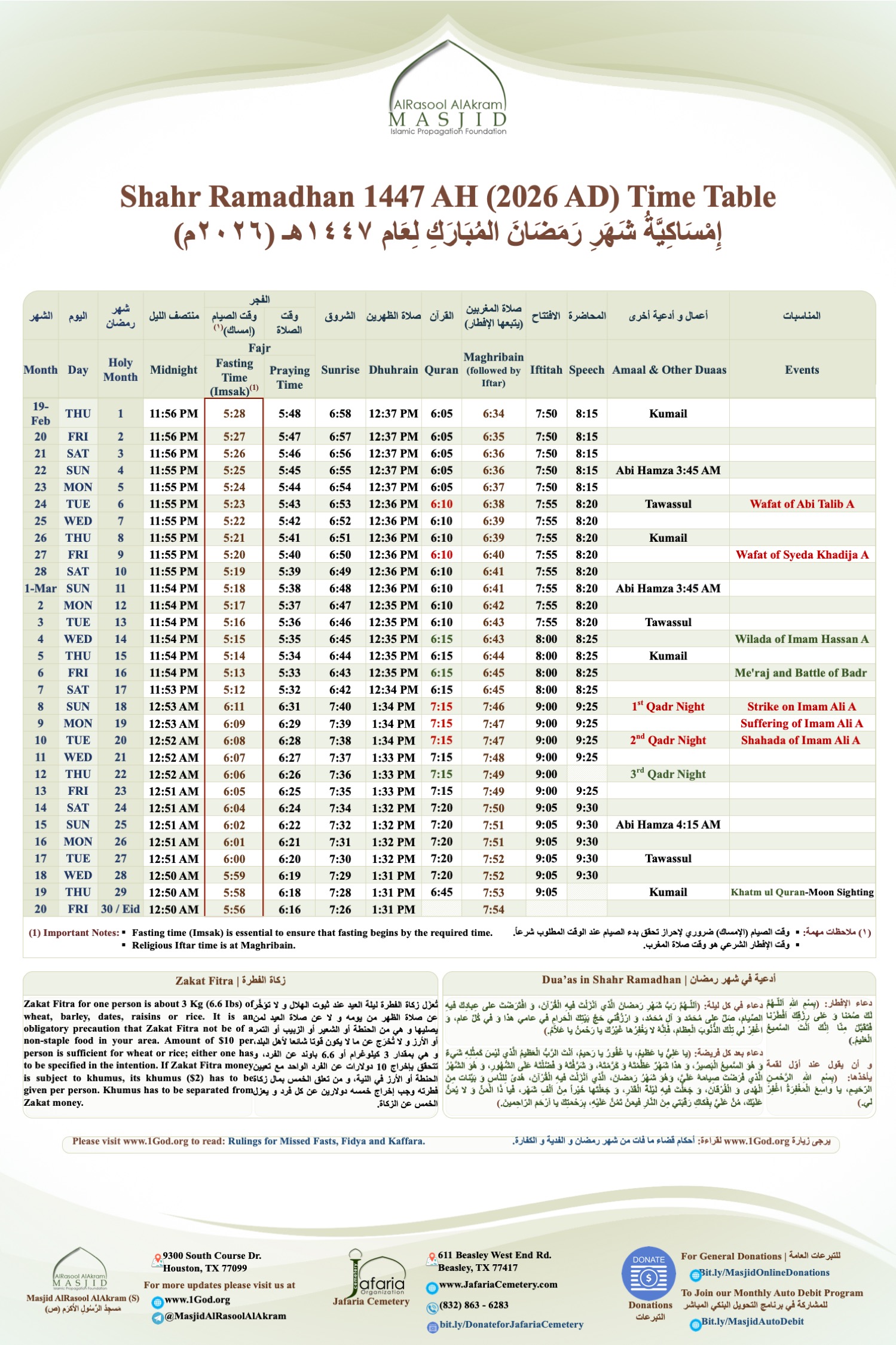 Shahr Ramadhan 1447/2026 Timetable (Imsakieh), Daily Duaa and Every Night's special Salah